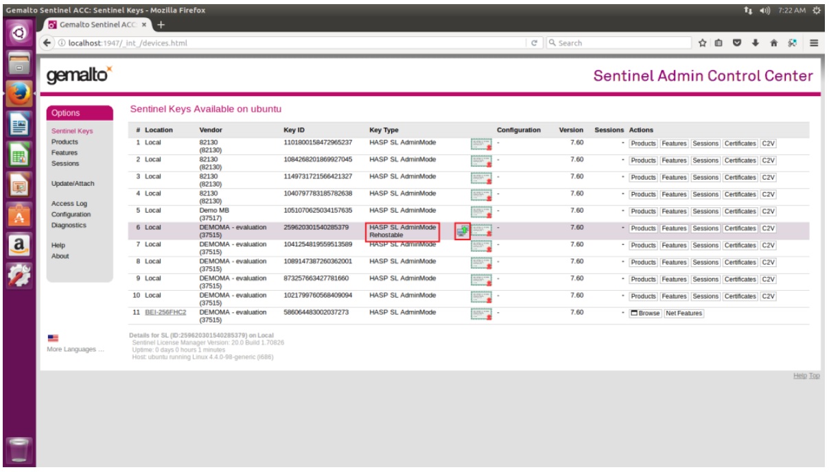 SL能夠?qū)崿F(xiàn) Rehost 的前提條件是 SL本身是可遷移的,也就是 Rehostable 的??梢赃M(jìn)入 A 電腦上打開 ACC(瀏覽器打開 http://localhost:1947,點(diǎn)擊 Sentinel Keys 查看 SL的狀態(tài)),如下邊截圖所示紅色框?qū)?yīng)的這個 SL就是 Rehostable的,可以遷移,其它SL都不可遷移。如果想遷移其它 SL,就必須將 SL升級為具備 Rehostable 屬性。 具體請看下邊的步驟二。