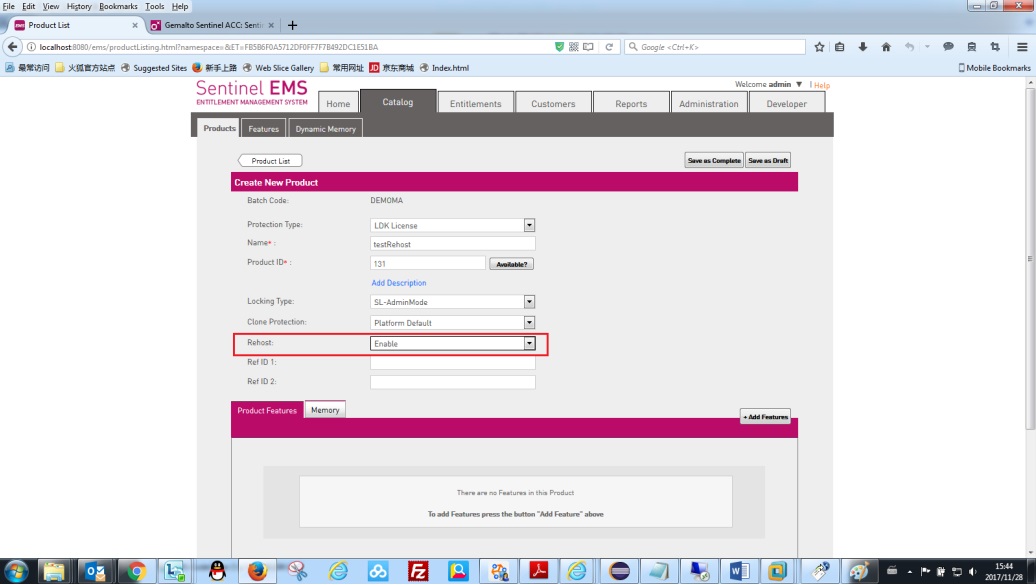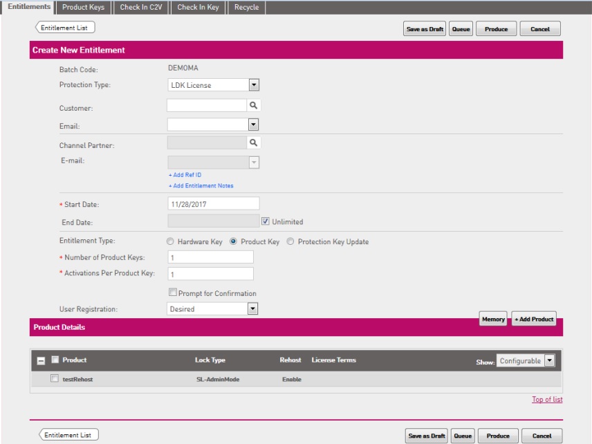 (c、 )去 EMS 里邊Entitlement 標(biāo)簽頁下,像正常升級加密鎖一樣的標(biāo)準(zhǔn)步驟進(jìn)行操作。新建 Entitlement,然后Entitlement type選擇中間的Product Key,添加上剛才定義的產(chǎn)品testRehost,然后點(diǎn)擊 Produce,接著 Activate。