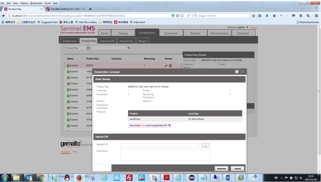 在Generate License窗口中,Upload C2V選擇之前A電腦上需要升級的SL產(chǎn)生的testRehost.c2v文件。然后點(diǎn)擊 Generate產(chǎn)生對應(yīng)的v2c 升級文件。