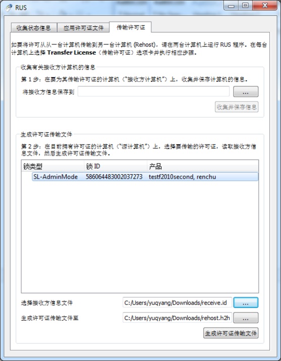 在 A 電腦上,同樣運(yùn)行RUS,選擇需要Rehost遷移的SL,“選擇接收方信息文件” 選擇 B 電腦上生成的receive.id;“生成許可證傳輸文件至” 選擇一個自定義的名字,比如為 rehost.h2h。點(diǎn)擊右下角的按鈕“生成許可證傳輸文件”即可生成rehost.h2h。將這個 rehost.h2h文件發(fā)給B電腦。