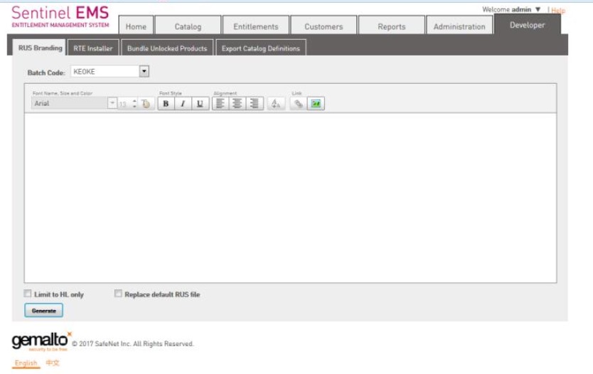 去開發(fā)電腦上打開 EMS,進(jìn)入 Developer 標(biāo)簽頁,可以看到RUS Branding標(biāo)簽頁, BatchCode選擇你的正式號(比如截圖中的 KEOKE),插上主鎖,點(diǎn)擊左下角的 Generate,就可以產(chǎn)生正式號對應(yīng)的 RUS 遠(yuǎn)程升級工具。